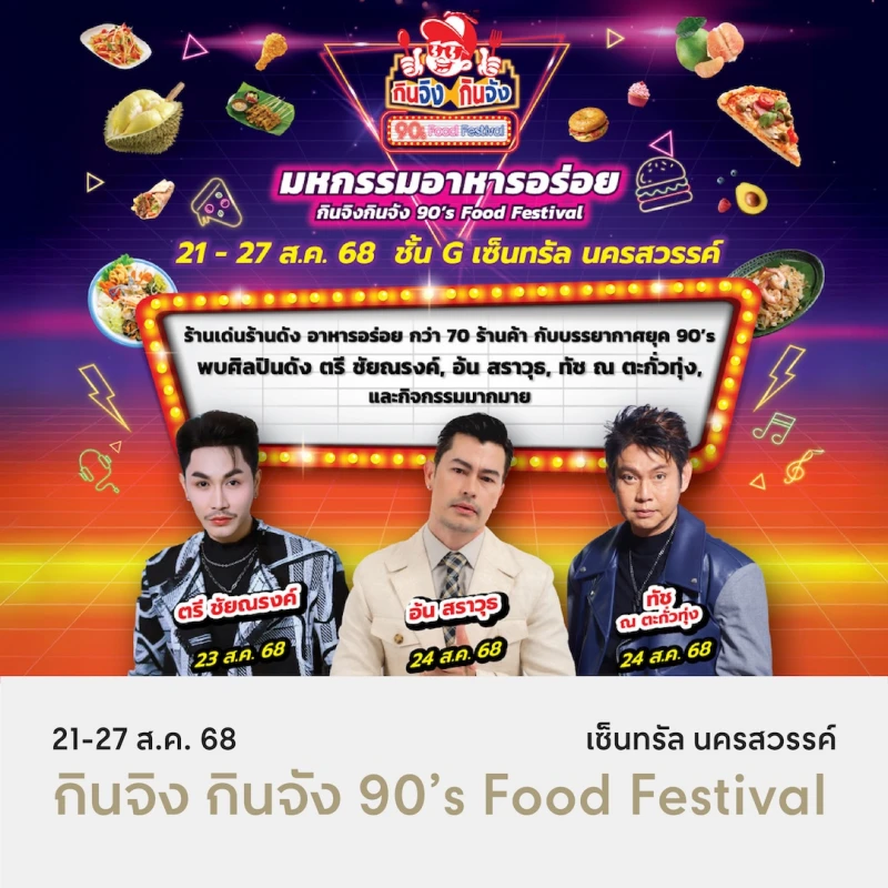 😚 21-27 ส.ค. 68 มหกรรมอาหารอร่อย กินจิง กินจัง 90’s Food Festival 📌 เซ็นทรัล นครสวรรค์ ไฮไลต์! พบศิลปินชื่อดัง