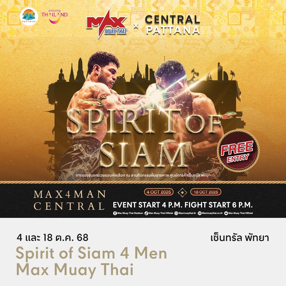 🥊 4 และ 18 ต.ค. 68 งานศึกมวยไทยเวทีสากล Spirit of Siam 4 Men Max Muay Thai 📌 เซ็นทรัล พัทยา