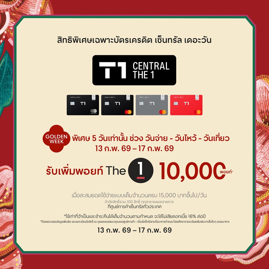 💳 รับเพิ่มพอยท์ The 1 จำนวน 10,000 พอยท์* สำหรับสมาชิกบัตรเครดิต เซ็นทรัล เดอะวัน เมื่อสะสมยอดใช้จ่ายแบบเต็มจำนวนครบ 15,000 บาทขึ้นไป/วัน (สิทธิ์มีจำนวนจำกัด)