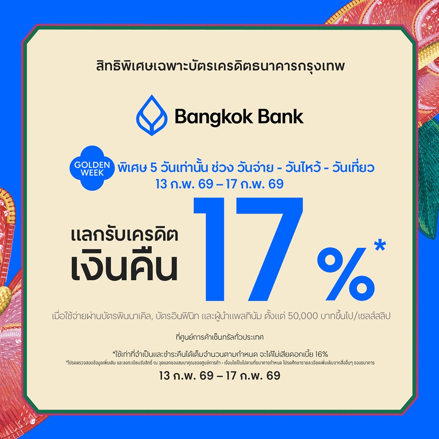 💳 แลกรับเครดิตเงินคืน 17%* สำหรับสมาชิกบัตรเครดิตธนาคารกรุงเทพ เมื่อใช้จ่ายผ่านบัตรพินนาเคิล, บัตรอินฟินิท และผู้นำแพลทินัม ตั้งแต่ 50,000 บาทขึ้นไป/เซลส์สลิป