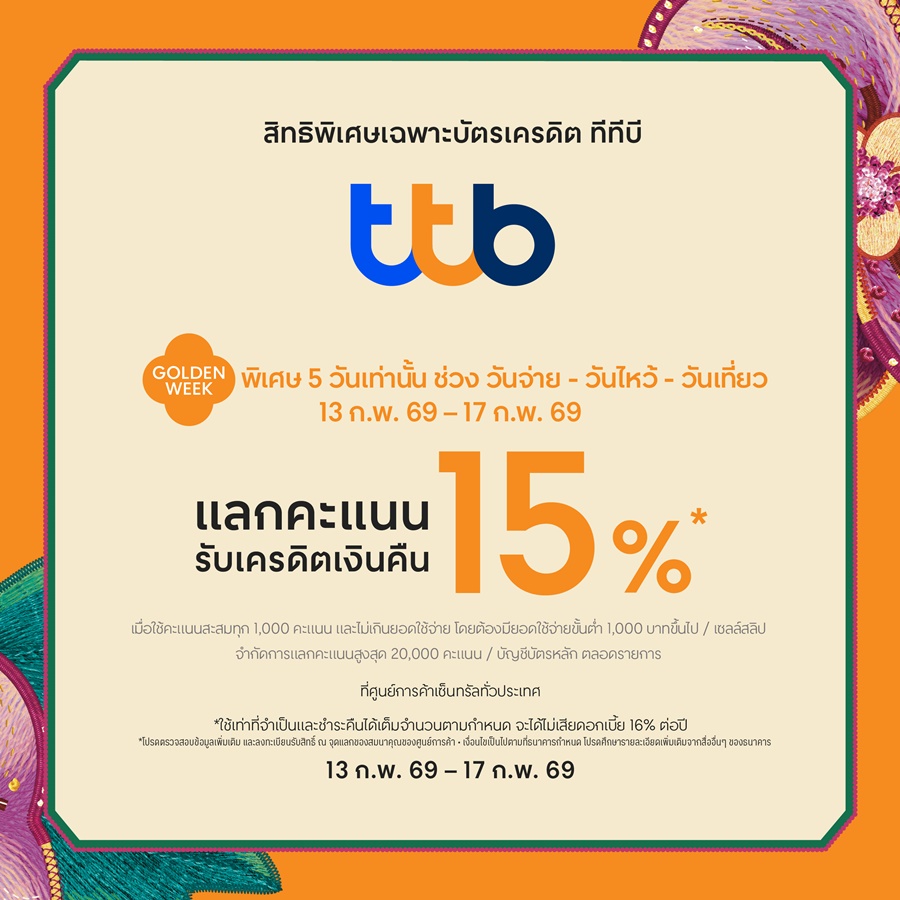 💳 รับเพิ่ม เครดิตเงินคืน 15%* สำหรับสมาชิกบัตรเครดิตทีทีบี บัตรเครดิตทีเอ็มบี และบัตรเครดิตธนชาต เมื่อใช้คะแน นสะสมทุก 1,000 คะแนน และไม่เกินยอดใช้จ่าย โดยต้องมียอดใช้จ่ายขั้นต่ำ 1,000 บาทขึ้นไป/เซลส์สลิป