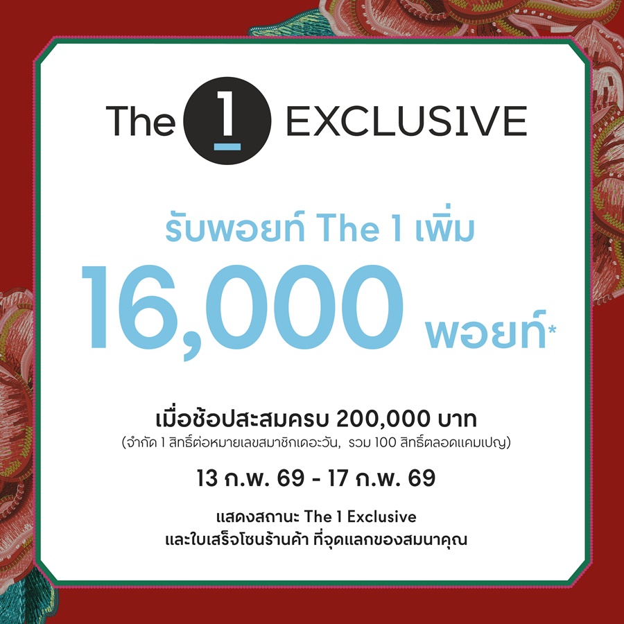 ✨สิทธิพิเศษสำหรับ The 1 Exclusive รับพอยท์เพิ่ม 16,000 พอยท์* เมื่อช้อปสะสมครบ 200,000 บาท ( สิทธิ์มีจำนวนจำกัด )