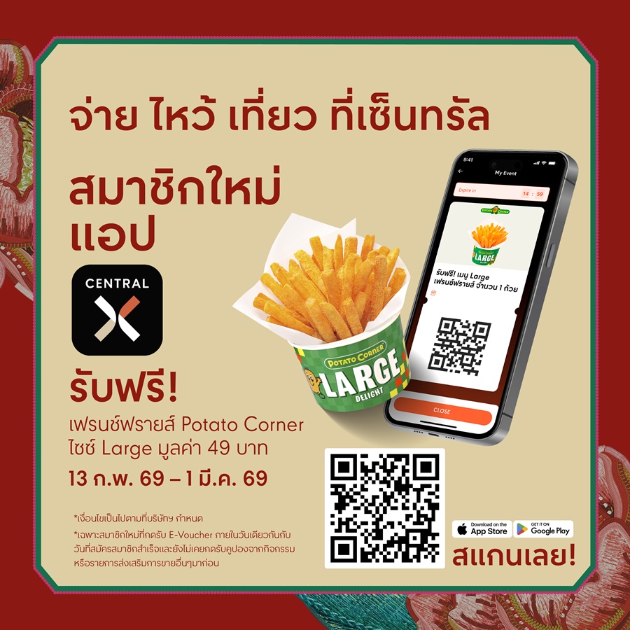 ✨ เฉพาะวันที่ 13 ก.พ. 69 – 1 มี.ค. 69 สมาชิกใหม่แอป CENTRAL X รับฟรี* เฟรนช์ฟรายส์ Potato Corner ไซส์ Large มูลค่า 49 บาท ( สิทธิ์มีจำนวนจำกัด )