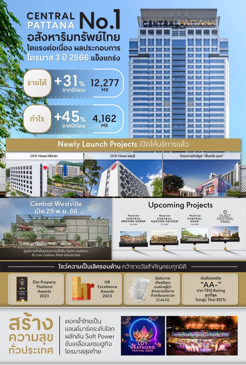 29 พ.ย.นี้ เตรียมเปิด เซ็นทรัล เวสต์วิลล์ ต้นแบบศูนย์การค้า Semi-outdoor & Low Carbon Mall ความยั่งยืนแห่งอนาคต โดยใน Q3/2566 ที่ผ่านมา ได้เปิดตัวโครงการใหม่ตามแผน ได้แก่