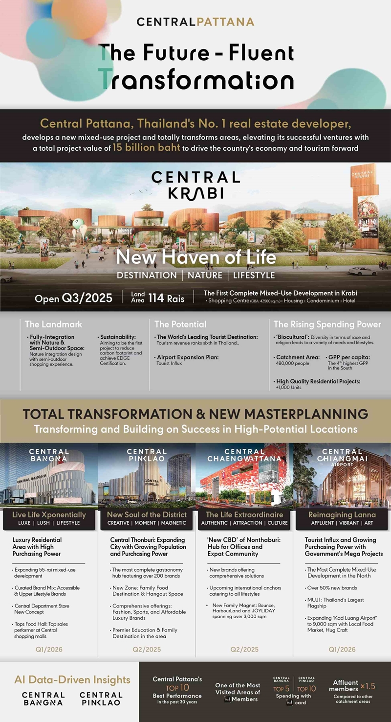 Mr. Chanavat Uahwatanasakul, Chief Development and Commercial Officer, Central Pattana plc, said: “Central Pattana is moving into the future and preparing for major changes. Throughout many years as a developer, we have created ‘future-fluent development’ geared for people and communities and have sincerely cared for the environment. We highlighted the ‘Center of Life’ concept to improve the quality of life in every community and city to spread prosperity throughout the country. The development plan for 2024-2026 consists of five projects with a combined value of over 15 billion baht, led by ‘Central Krabi’, the first mixed-use project in the province, worth 4.5 billion baht, scheduled to open in Q3/2025. The total transformation projects with a combined value of over 10 billion baht comprise ‘Central Bangna’, to be revealed in Q1/2026, and ‘Central Pinklao’, set to be revealed in Q2/2025, ‘Central Chaengwattana’, due to be revealed in Q2/2025, ‘Central Chiangmai Airport’, to be revealed in Q1/2026,”