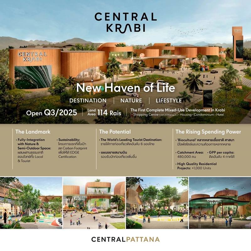 Central Krabi – New Haven of Life, a mixed-use project with a total value of 4.5 billion baht, located on 114 rai of land consisting of Central shopping center (GFA:47,500 m2) which is scheduled to open in Q3/2025. This will be followed by the development of a housing estate, condominium and hotel. Krabi is Thailand’s high-potential provincial tourist destination, with a global reputation and strong purchasing power.