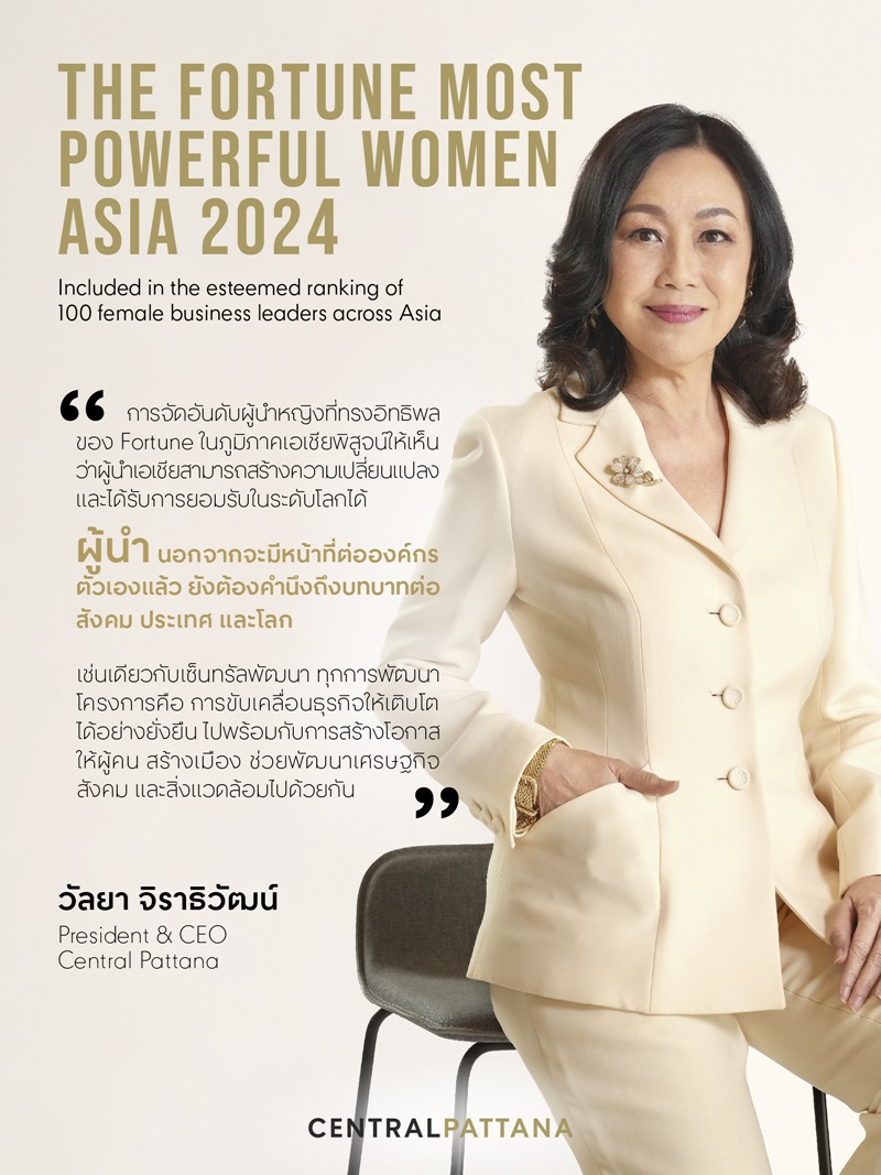 Wallaya Chirathivat, the first female CEO of – Central Pattana Plc., has been named one of Fortune’s 100 Most Powerful Women of Asia. The rankings represent a broad spectrum of sectors including finance, energy, transportation, food and beverages, and hospitality. It recognizes women who are redefining the concept of leadership by transforming companies, disrupting industries and driving growth, innovation and business excellence, whilst inspiring the next generation of leaders.