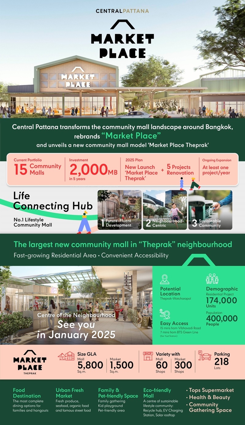 Bangkok – Central Pattana plc, Thailand's No.1 real estate developer for sustainability, operates under the vision of 'Imagining better futures for all,' connecting retail, residential, hotel, and office spaces to strengthen 'The Ecosystem for All.' The company is continuing its business development and has unveiled a major rebranding strategy to modernize the community mall landscape around Bangkok and create a strong brand: 'Market Place,' aimed at targeting growing urban areas, supporting high purchasing power, and better meeting customer needs. Central Pattana is investing 2 billion baht in 5 years the renovation and development of 15 projects in high-potential locations, including Market Place J Avenue, Market Place La Villa, Market Place Nanglinchee, Market Place Phahonyothin, Market Place Krungthep Kreetha, Market Place Pracha Uthit, and Market Place Kaset-Nawamin, etc. The company is also preparing to launch a new project, 'Market Place Theprak,' featuring a 'community mall and urban fresh market' model in the heart of the Theprak-Watcharapol, set to open in January 2025 in time for the grand Chinese New Year celebration."