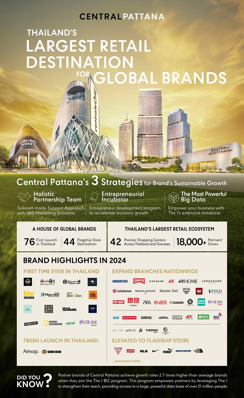 Bangkok – Central Pattana plc, Thailand’s no.1 real estate developer for sustainability under the vision of ‘Imagining better futures for all’ and developer of Central shopping centers, residentials, office buildings and hotels nationwide, is highlighting its reputation as the number one shopping center developer in Thailand, trusted by both Thai and international brands as the destination to open their first branches and flagship stores. Central Pattana has a total of 41 shopping centers nationwide and one in Malaysia, and dedicated team to comprehensively serve all partner brands. In addition, Central Pattana offers a strong Retail Incubation Program – ‘Lead’ by Central Pattana, which has helped support the success of more than 200 new brands. Central Pattana’s big data also helps strengthen our partners and customers, following the principle of ‘The Ecosystem for All’ to support all parties achieving sustainable growth.