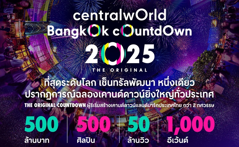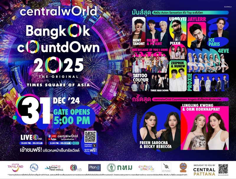 Celebrate the New Year countdown together in centralwOrld Bangkok Countdown 2025 – the original, and Thailand Countdown 2025 nationwide, supported by leading public and private sector partners, including, the Tourism Authority of Thailand, Bangkok Metropolitan Administration, Royal Thai Police, Galderma (Thailand) Co., Ltd., Better Way International Co., Ltd., Toyota Motor Thailand Co., Ltd., Boonrawd Trading Co.,Ltd, Advanced Wireless Network Co., Ltd., Thai Honda Co., Ltd., Chang Mineral Water, Coca-Cola (Thailand) Co., Ltd., Haadthip plc, Wan Thai Foods Industry Co., Ltd., Advice IT Infinite plc., Suntory PepsiCo Beverage (Thailand) Co., Ltd., The1, Plan B and Channel 3 HD.