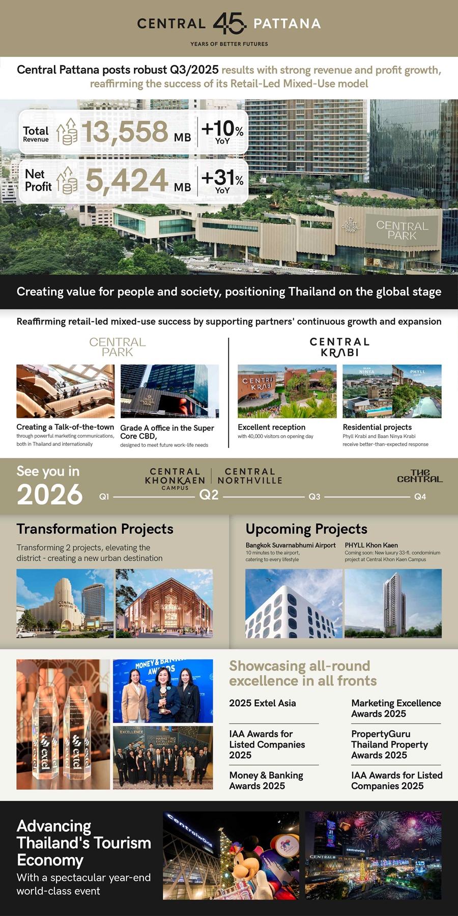 Central Pattana posts robust Q3/2025 results with strong revenue and profit growth, reaffirming the success of its Retail-Led Mixed-Use model.