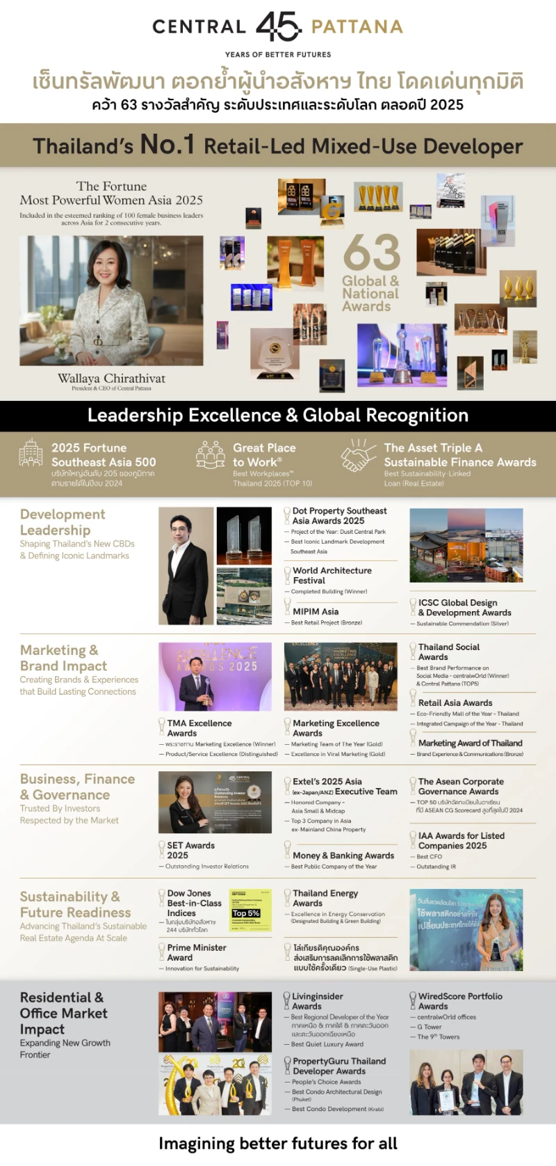 Bangkok – Central Pattana plc., Thailand’s No.1 sustainable real estate leader, under the vision “Imagining better futures for all,” integrating Retail, Residence, Hotel, and Office businesses, announced a landmark achievement in 2025 by winning 63 major awards from prestigious national and international platforms. These accolades span Business and Financial Performance, Development and Design, Marketing, People Development, and Sustainability, reaffirming Central Pattana’s position as the No.1 leader in Thailand’s real estate sector.