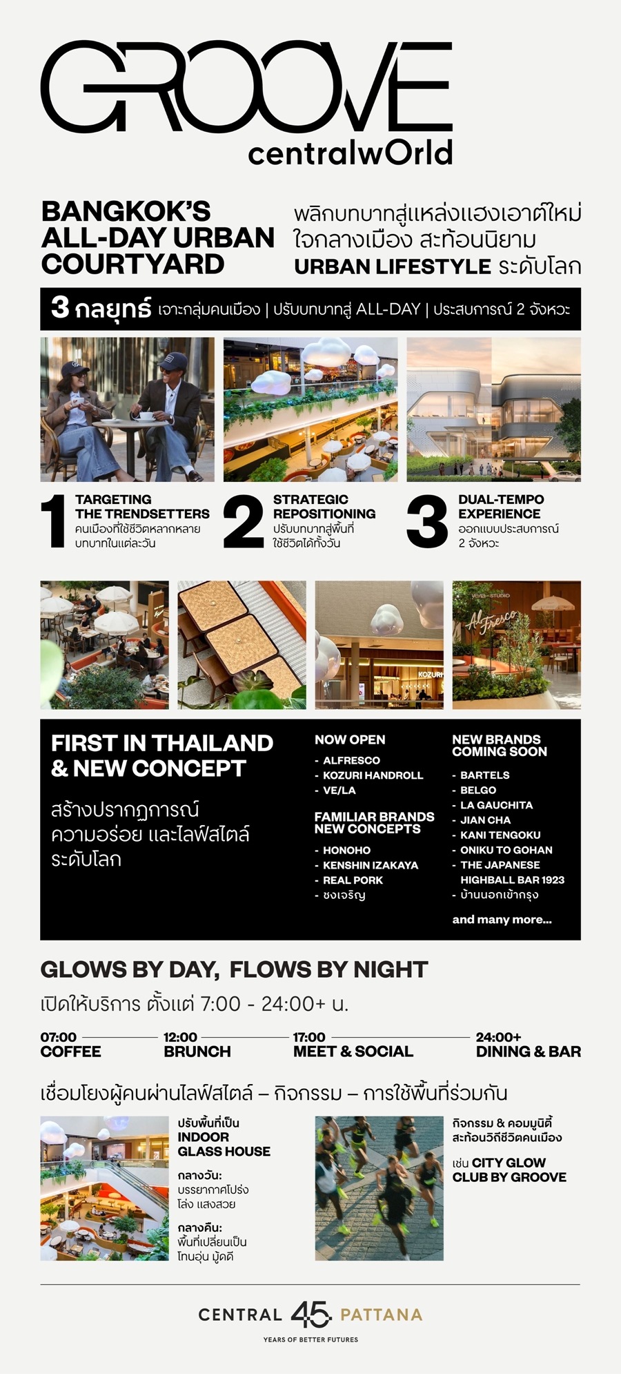 Bangkok – Central Pattana plc, the operator of centralwOrld, Bangkok’s global lifestyle landmark, has moved forward with a complete transformation of Groove, repositioning the once talk-of-the-town destination into ‘Bangkok’s all-day urban courtyard’ in response to the evolving lifestyles of modern urban consumers.