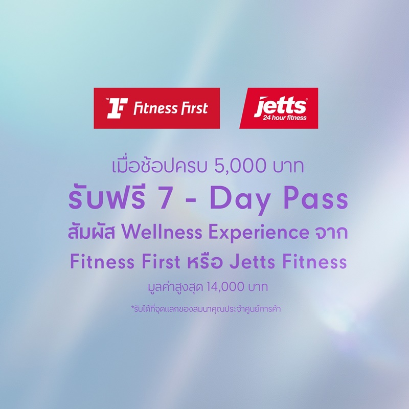 ✅ เมื่อช้อปครบ 5,000 บาท* รับฟรี 7-Day Pass สัมผัส Wellness Experience จาก Fitness First หรือ Jetts Fitness มูลค่าสูงสุด 14,000 บาท