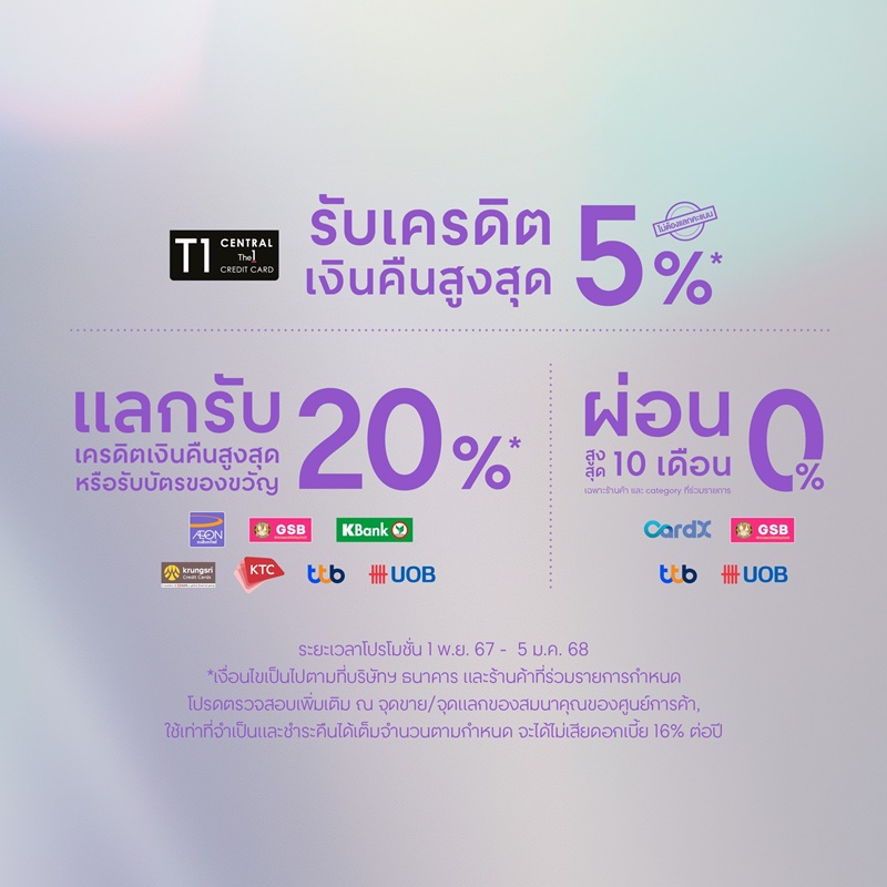 ✅ รับเครดิตเงินคืนสูงสุด 5%* ไม่ต้องแลกคะแนน สิทธิพิเศษเฉพาะบัตรเครดิต เซ็นทรัล เดอะวัน