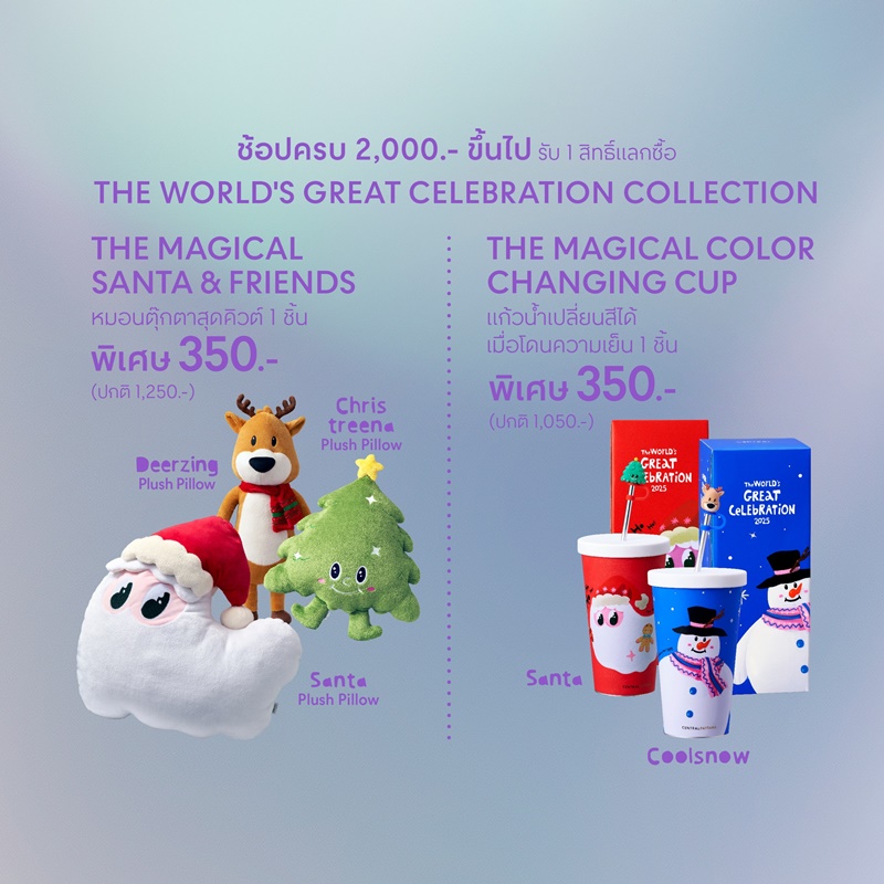 - The Magical Santa & Friends หมอนตุ๊กตาสุดคิวต์ 1 ชิ้น ราคาพิเศษ 350 บาท จากปกติ 1,250 บาท หรือ The Magical Color Changing Cup แก้วน้ำเปลี่ยนสีได้เมื่อโดนความเย็น 1 ชิ้น ราคาพิเศษ 350 บาท จากปกติ 1,050 บาท