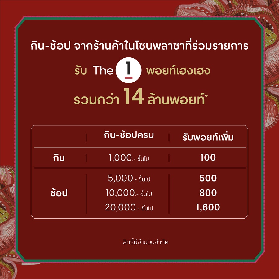 ✨รับคะแนน The 1 เฮง เฮง พอยท์ รวมกว่า 14 ล้านพอยท์* เมื่อกิน–ช้อป จากร้านค้าในโซนพลาซาที่ร่วมรายการ