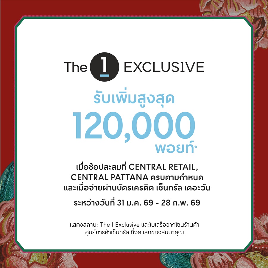 สิทธิพิเศษสำหรับสมาชิก The 1 Exclusive รับเพิ่มสูงสุด 120,000 พอยท์* เมื่อช้อปสะสมครบตามเงื่อนไข ที่ Central Retail และ Central Pattana