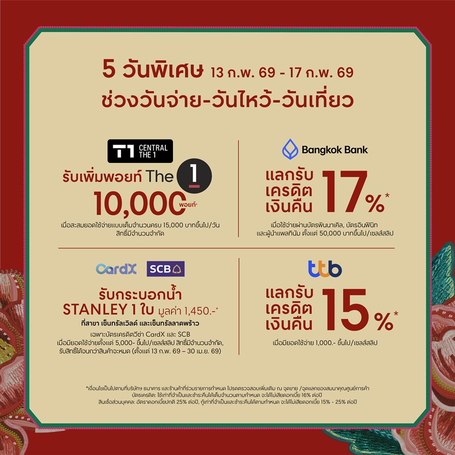 👉🏻รับกระบอกน้ำ STANLEY 1 ใบ มูลค่า 1,450 บาท* สำหรับสมาชิกบัตรเครดิตวีซ่า CardX และ SCB เมื่อใช้จ่ายตั้งแต่ 5,000 บาทขึ้นไป/เซลส์สลิป ณ ร้านค้าเช่าในโซนศูนย์การค้าเซ็นทรัลเวิลด์ และเซ็นทรัล ลาดพร้าว (ตั้งแต่ 13 ก.พ. 69 – 30 เม.ย. 69)