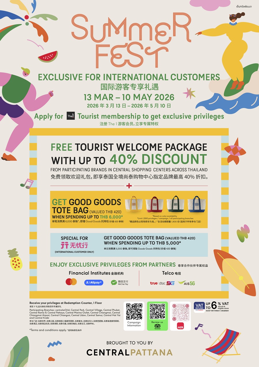 - Free Tourist Welcome Package with up to 40% discount from participating brands in Central Shopping Centers across Thailand