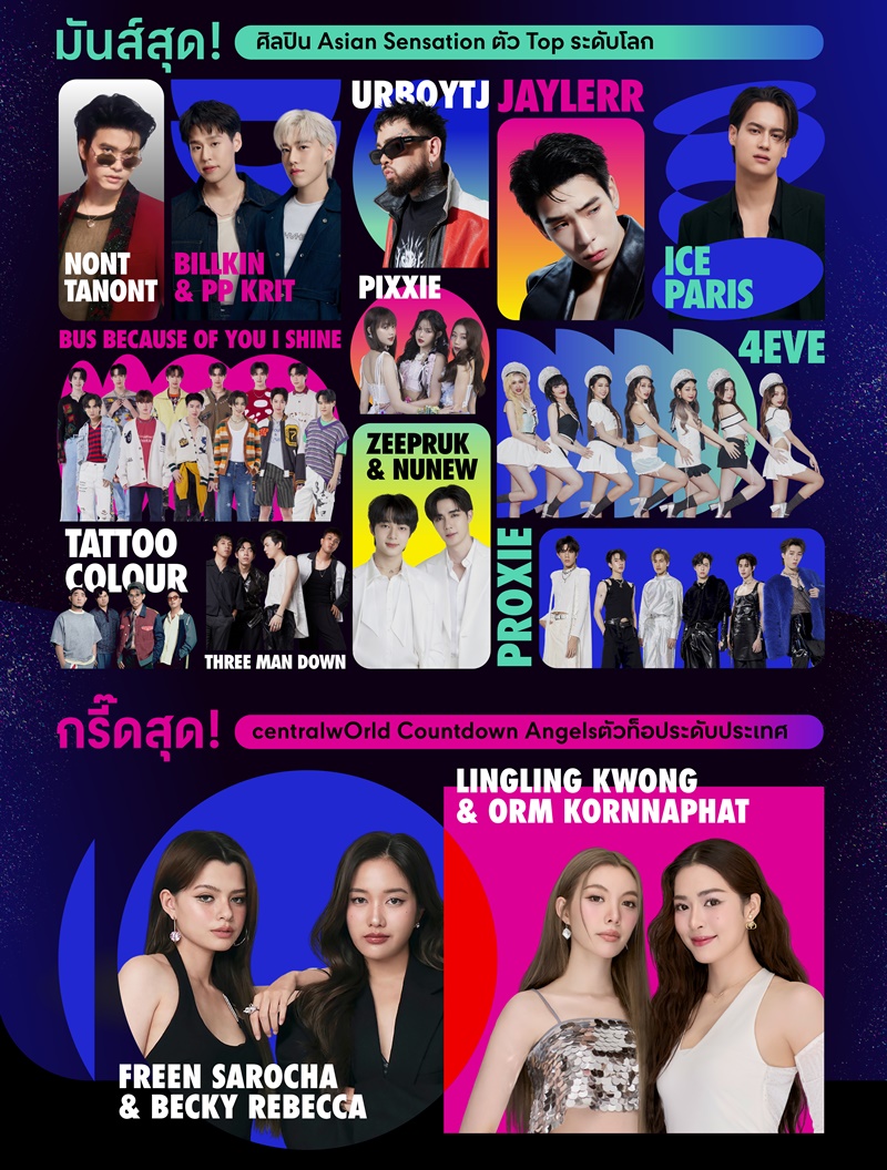 Billkin-PP Krit, BUS becouse of you I shine, PROXIE, PiXXiE, 4EVE, Jaylerr และศิลปินท็อปชาร์ค NONT TANONT, Ice Paris, Tattoo Colour, Three Man Down, URBOYTJ, ZeeNunew พร้อมกรี๊ดสุดเสียงกับ centralwOrld Countdown Angels: พรีม-เบ็คกี้, หลิงหลิง-ออม และเคานต์ดาวน์ไปกับโอปอล สุชาดา Miss Universe Thailand 2024