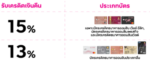 | ยอดใช้จ่ายแบบเต็มจำนวน/เซลส์สลิป | รับเครดิตเงินคืน* |