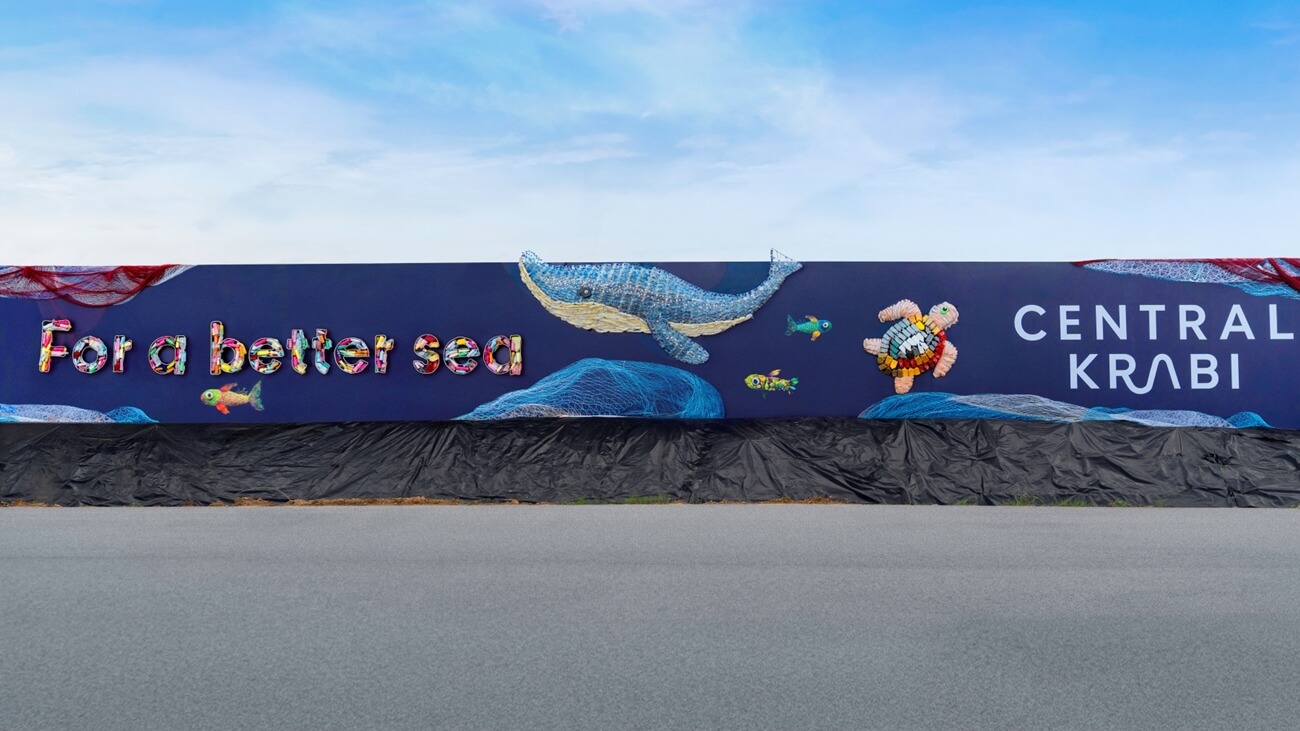 โดยผลงาน Eco-Art Hoarding บนป้ายแนวรั้วโครงการ ‘เซ็นทรัล กระบี่’ สร้างสรรค์จากขยะพลาสติกในทะเลกว่า 3,500 ชิ้น กว่า 360 กิโลกรัม อาทิ ขวด PET, HDPE, PP, ฝาขวด, ถุงพลาสติก, เชือก และเศษอวน โดยออกแบบเป็นภาพสัตว์ทะเลใกล้สูญพันธุ์ในทะเลกระบี่ เช่น วาฬบรูด้า ฉลามวาฬ และเต่ามะเฟือง ขยะพลาสติกทุกชิ้นจะไม่ถูกลงสี แต่เลือกชิ้นที่มีสีใกล้เคียงกับสัตว์ทะเล เพื่อสะดวกต่อการอัพไซเคิลหลังโครงการเสร็จสิ้น สะท้อนความมุ่งมั่นที่จะทำให้ทะเลกระบี่และชีวิตผู้คนดีขึ้น ตามข้อความ ‘For a Better Sea, For a Better Life’ ที่ปรากฏบนผลงาน เพื่อสร้างแรงบันดาลใจในการอนุรักษ์สิ่งแวดล้อมและส่งเสริมการท่องเที่ยวอย่างยั่งยืน พร้อมตอกย้ำความมุ่งมั่นของเซ็นทรัลพัฒนาในการสร้างความยั่งยืนในทุกขั้นตอนของโครงการ