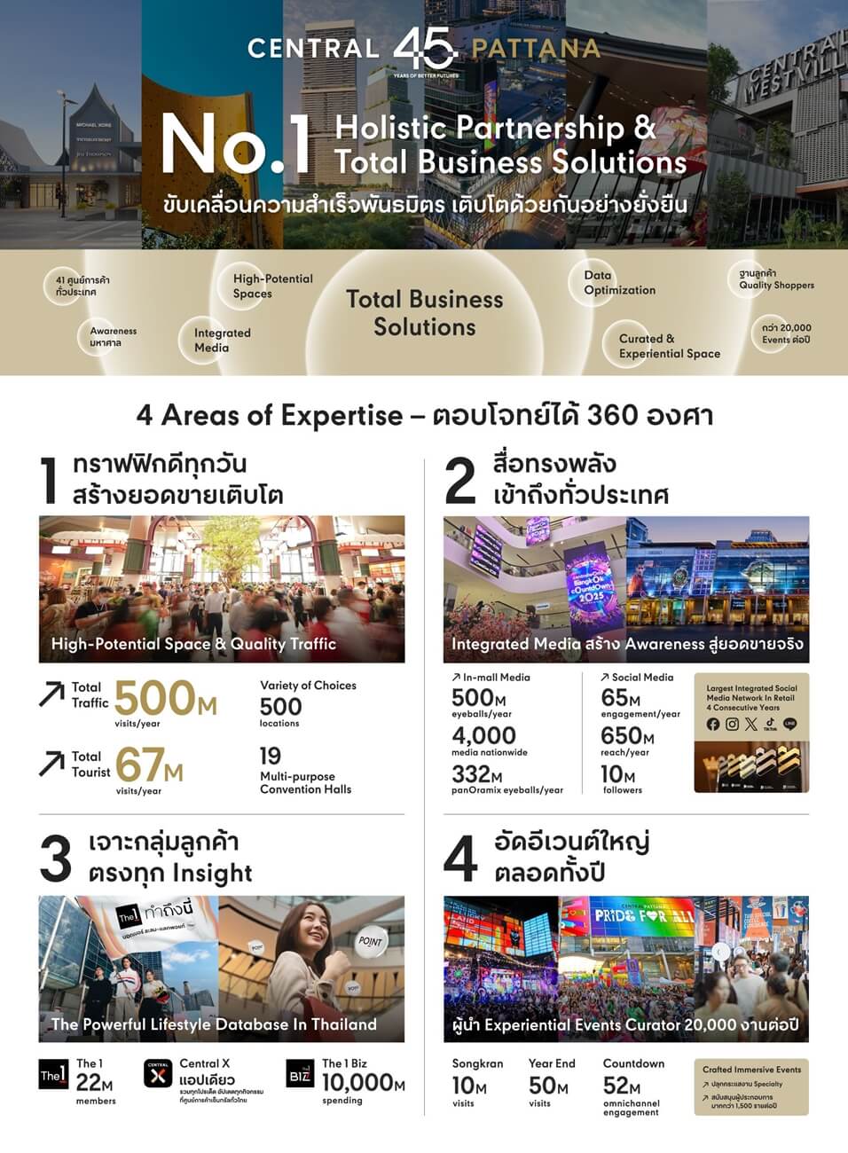 กรุงเทพฯ - บริษัท เซ็นทรัลพัฒนา จำกัด (มหาชน) ผู้นำเบอร์หนึ่งอสังหาริมทรัพย์ไทย ประกาศศักยภาพ ‘Holistic Partnership’ ตัวจริงที่ช่วยขับเคลื่อนความสำเร็จของพาร์ทเนอร์ทุกระดับด้วย Business Solutions และ Ecosystem ที่แข็งแกร่ง ด้วย 4 ความเชี่ยวชาญที่ตอบโจทย์พันธมิตรธุรกิจแบบ 360 องศา ได้แก่ 1) High-Potential Spaces 2) Integrated Media ครอบคลุมทุก Touchpoint สร้าง Massive Awareness สู่ยอดขายจริง 3) Data Optimization มี Consumer Insights และ ฐานลูกค้า Quality Shoppers ทั่วประเทศ 4) Curated & Experiential Events ทุกสเกลกว่า 20,000 งานต่อปี ตอกย้ำ ‘ศูนย์การค้า’ ที่พร้อมผลักดันพันธมิตรธุรกิจเติบโตไปด้วยกันอย่างยั่งยืน