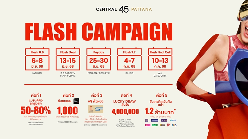 - อัด 5 โปร Flash Deal ดีลเร็วและแรง (6, Mid month, Payday, 7.7 และ Final Call) พร้อมโปรแรง 5 ต่อ* ช้อปและลุ้น อาทิ ช้อป 1,000 รับ The 1 – 1,000 คะแนน, ช้อป 1,000 ฟรีตั๋วหนัง, สมาชิก The 1 กิน-ช้อป ที่ศูนย์การค้าเซ็นทรัล ลุ้น Lucky Draw The 1 – 4,000,000 คะแนน และรับเครดิตเงินคืนกว่า 1.2 ล้านบาท จากบัตรเครดิตที่ร่วมรายการ