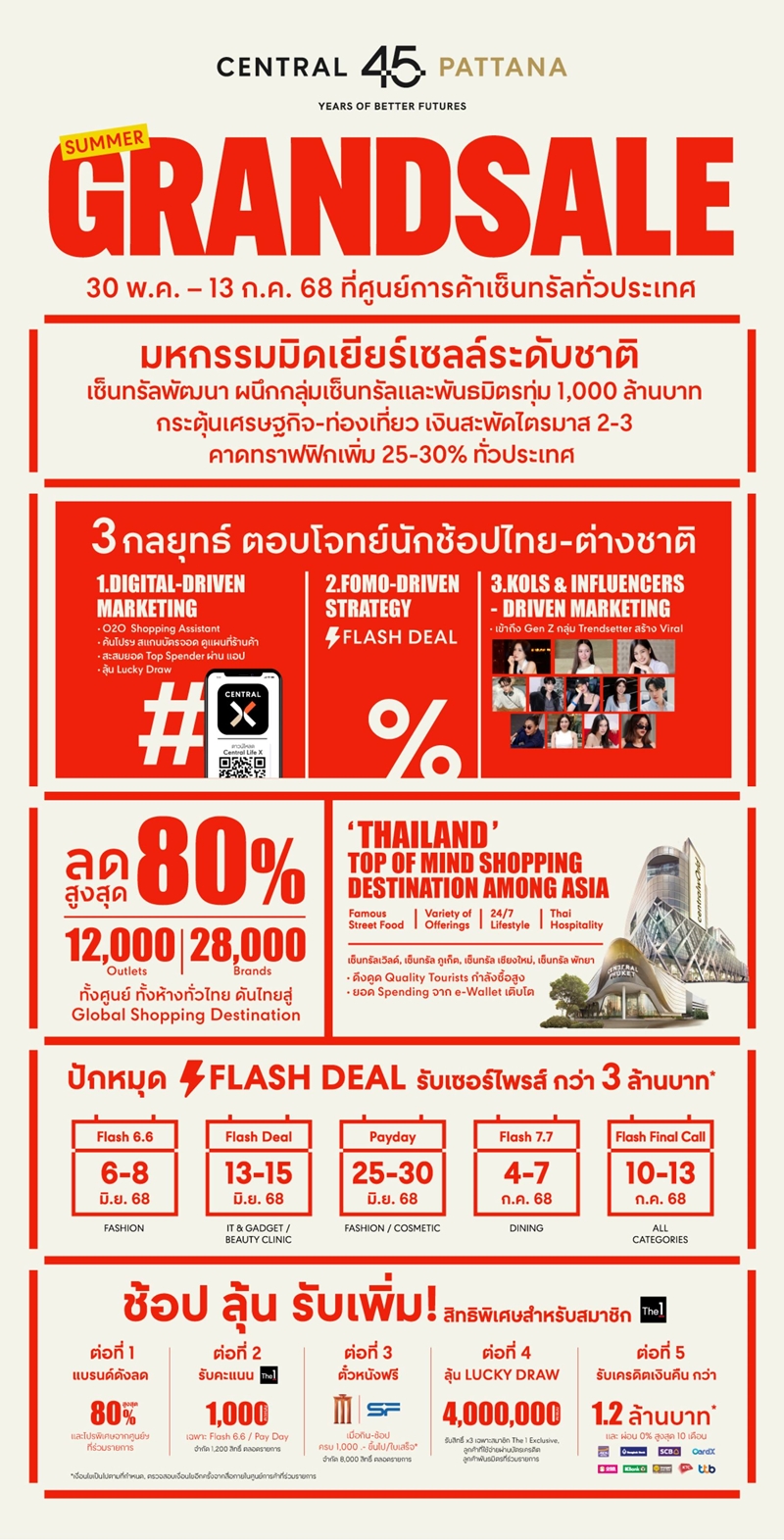 เซ็นทรัลพัฒนา ผนึกกลุ่มเซ็นทรัลและพันธมิตรทุ่ม 1,000 ล้านบาท จัดแคมเปญ “Summer Grand Sale 2025” มหกรรมมิดเยียร์เซลล์ระดับชาติ กระตุ้นเศรษฐกิจ-ท่องเที่ยว
