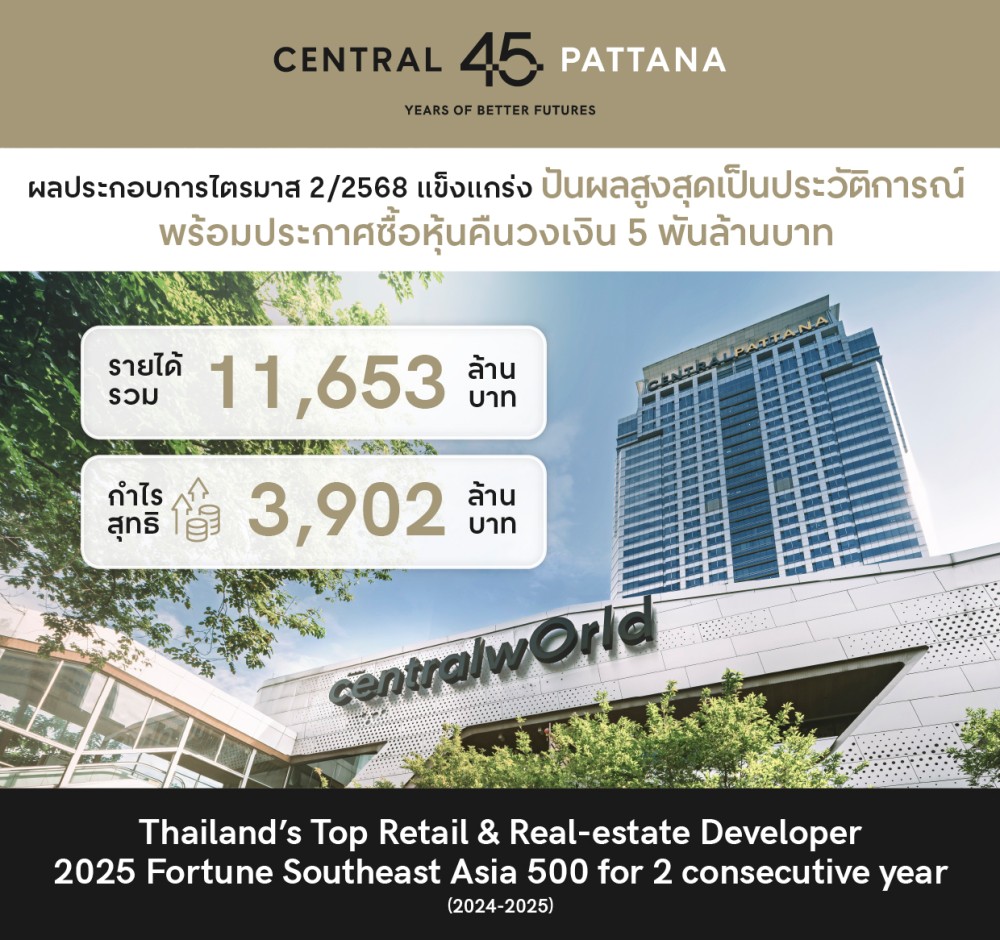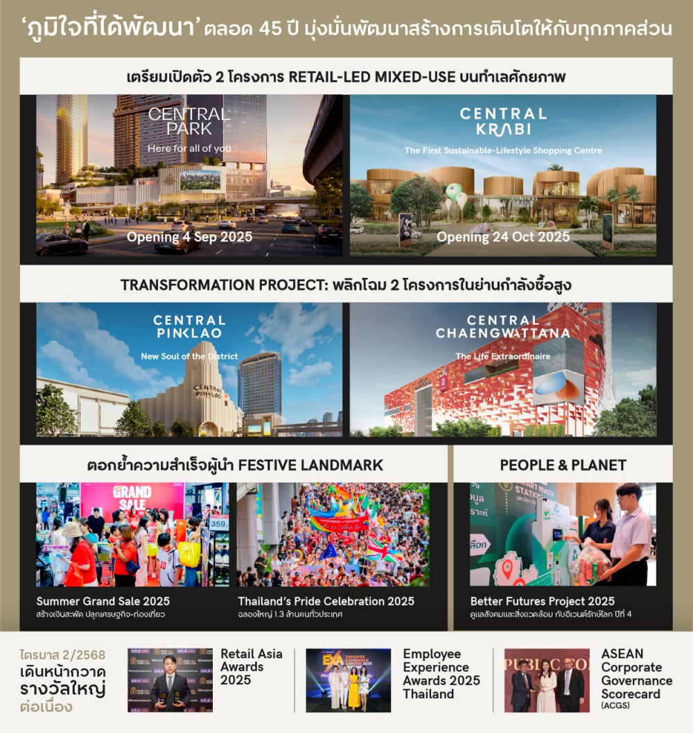 กรุงเทพฯ: บริษัท เซ็นทรัลพัฒนา จำกัด (มหาชน) เปิดผลประกอบการไตรมาส 2 ปี 2568 เติบโตแข็งแกร่งต่อเนื่องจากธุรกิจศูนย์การค้า บริษัทฯ มีรายได้รวม 11,653 ล้านบาท โต 3% และกำไรสุทธิ 3,902 ล้านบาท โต 10% จากปีก่อน (ไม่รวมธุรกิจอสังหาริมทรัพย์) โดยในไตรมาส 2 นี้ บริษัทฯ ได้ดำเนินการจ่ายเงินปันผล 2.10 บาทต่อหุ้น ซึ่งสูงสุดเป็นประวัติการณ์ สะท้อนฐานะทางการเงินที่แข็งแกร่งด้วยอัตราภาระหนี้สินต่อทุนที่ปรับตัวดีขึ้นเรื่อยๆ พร้อมสร้างผลตอบแทนเพิ่มขึ้นต่อเนื่องให้กับผู้ถือหุ้นในปี 2568 โดยประกาศซื้อหุ้นคืนวงเงินไม่เกิน 5 พันล้านบาทระหว่างวันที่ 18 สิงหาคม 2568 - 17 กุมภาพันธ์ 2569 เดินหน้าขับเคลื่อนแผนการเติบโตครั้งใหญ่ เปิดตัวเมกะโปรเจกต์ "เซ็นทรัล พาร์ค" ไตรมาส 3 และ "เซ็นทรัลกระบี่" ไตรมาส 4 เติมเต็มแลนด์มาร์กระดับโลกและกระจายศักยภาพสู่เมืองท่องเที่ยว ตอกย้ำบทบาทผู้นำการพัฒนาเมืองและเศรษฐกิจไทย ภายใต้แนวคิด "The Ecosystem for All" ที่เชื่อมโยงความแข็งแกร่งของทุกภาคส่วน ทั้งธุรกิจ ชุมชน สังคม และสิ่งแวดล้อม ให้เติบโตไปด้วยกันอย่างมั่นคงและยั่งยืน พร้อมคว้ารางวัลแห่งความสำเร็จในทุกมิติ สะท้อนถึงความมุ่งมั่นและความ “ภูมิใจที่ได้พัฒนา” ตลอด 45 ปีของเซ็นทรัลพัฒนา เพราะความสุขของคุณคือความภูมิใจของเรา