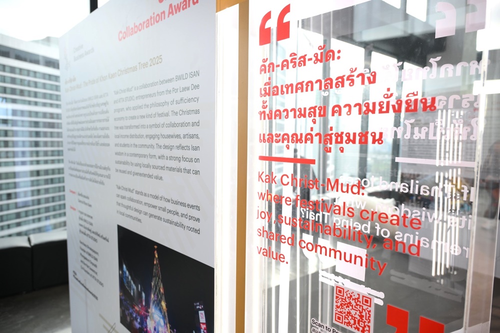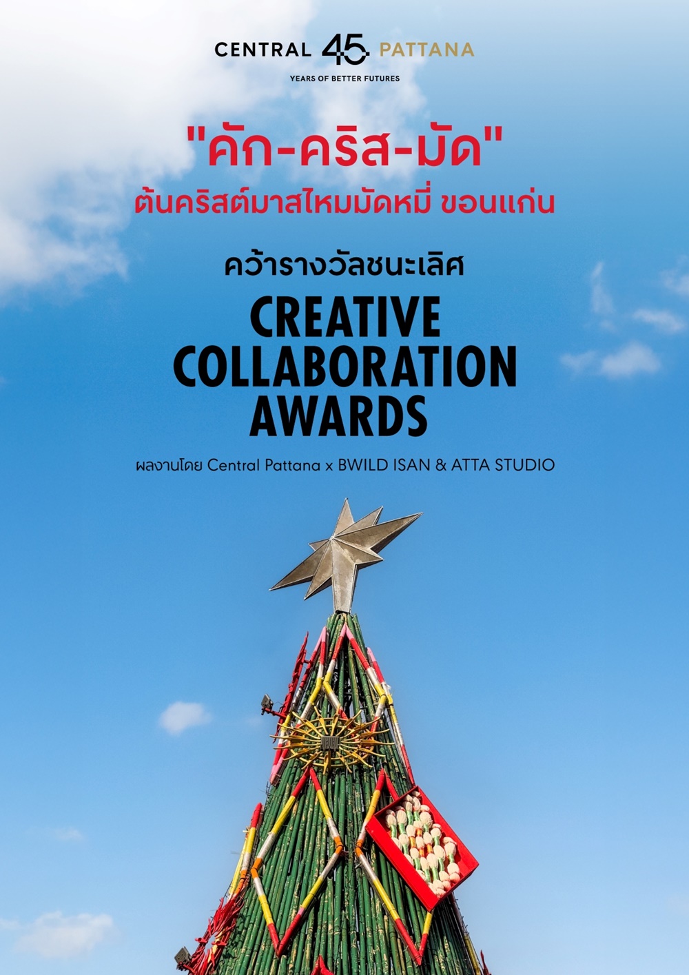 “ต้นคริสต์มาสไหมมัดหมี่” ได้รับรางวัลชนะเลิศ Creative Collaboration Awards ซึ่งผลงานชิ้นนี้สะท้อนให้เห็นถึงพลังความร่วมมือจากทุกภาคส่วน ทั้งภาคเอกชนอย่างเซ็นทรัลพัฒนา ในฐานะผู้พัฒนา Place for All ที่มุ่งยกระดับให้พื้นที่ศูนย์การค้าเป็นเดสติเนชั่นที่เชื่อมโยงเมือง ผู้คนในชุมชน และศิลปินท้องถิ่น ทั้งจากทีมดีไซเนอร์ BWILD ISAN และสถาปนิก ATTA STUDIO ตลอดจนพันธมิตรการท่องเที่ยวแห่งประเทศไทย (ททท.) ภาครัฐและเอกชนที่ให้การสนับสนุน รวมถึงกลุ่มช่างฝีมือและชุมชนท้องถิ่นในจังหวัดขอนแก่น ที่ต่างมีส่วนร่วมถ่ายทอดอัตลักษณ์ ‘เมืองมัดหมี่โลก’ สู่สายตาผู้คนทั่วโลก โดยผลงาน คัก-คริส-มัด เป็นมากกว่างานศิลป์ประดับเมือง แต่เป็นสัญลักษณ์ของการใช้เทศกาลเป็นพื้นที่แห่งความร่วมมือและความยั่งยืน ที่เปิดโอกาสให้ทุกภาคส่วนมีส่วนร่วมในการสร้างคุณค่า ทั้งในเชิงเศรษฐกิจ สังคม และสิ่งแวดล้อม ตั้งแต่การออกแบบที่คำนึงถึง Circular Design การเลือกใช้วัสดุจากชุมชนที่สามารถนำกลับมา Re-Use และ Re-Design ได้จริง ไปจนถึงการคืนรายได้ให้กับชุมชน