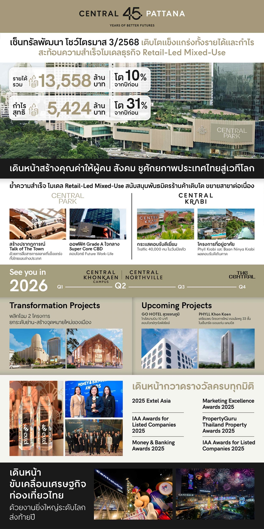 ตอกย้ำผู้นำธุรกิจอสังหาริมทรัพย์ของไทย คว้ารางวัล “บริษัทยอดเยี่ยมแห่งปี 2568” หมวดธุรกิจพัฒนาอสังหาริมทรัพย์ จากวารสารการเงินธนาคาร ในงาน Money & Banking Awards 2025 นับเป็นการคว้ารางวัลอันโดดเด่น 2 ปีซ้อน นอกจากนี้ ยังคว้ารางวัลจากเวทีใหญ่ระดับโลก 2025 Extel Asia (ex-Japan/ANZ) Executive Team รวม 2 รางวัลใหญ่ เป็นปีที่ 3 ได้แก่ Honored Company – Asia Small & Midcap และรางวัล Top 3 Company in Asia ex-Mainland China Property จัดโดย Extel Insights (เดิมคือ Institutional Investor Research) บริษัทวิจัยชั้นนำระดับโลกที่สำรวจความคิดเห็นจากผู้จัดการกองทุนและนักวิเคราะห์ 7,600 คนทั่วโลก นอกจากนี้ ตอกย้ำความเชื่อมั่นจากนักวิเคราะห์ในประเทศ คว้า 2 รางวัลจากเวที IAA Awards for Listed Companies 2025 ต่อเนื่องเป็นปีที่ 5 ในกลุ่มอุตสาหกรรมพัฒนาอสังหาริมทรัพย์ จัดโดย สมาคมนักวิเคราะห์การลงทุน คว้า 2 Gold Awards บนเวทีนานาชาติ Marketing Excellence Awards 2025 จัดโดย MARKETING-INTERACTIVE เพื่อยกย่องผลงานยอดเยี่ยมในอุตสาหกรรมการตลาดของประเทศไทย โดย ดร.ณัฐกิตติ์ ตั้งพูลสินธนา Chief Marketing Officer ผู้อยู่เบื้องหลังความสำเร็จทุกแคมเปญ นำทีมคว้ารางวัล ‘Marketing Team of The Year’ สุดยอดทีมการตลาดแห่งปี และรางวัล ‘Excellence in Viral Marketing’ จากแคมเปญ ‘International Tourist Privileges’ ที่พลิกความท้าทายการแข่งขันที่ดุเดือดของเซ็นทรัลเวิลด์ ด้วยกลยุทธ์การตลาด User Generated Content (UGC) เจาะนักท่องเที่ยวกลุ่มจีนและเอเชียที่นิยมใช้แพลตฟอร์ม Xiaohongshu (XHS) ดันทราฟฟิกและยอดใช้จ่ายทะลุเป้าเป็นประวัติการณ์, และคว้า 3 รางวัลใหญ่ จากเวที PropertyGuru Thailand Development Award 2025 งานประกาศผลรางวัลสุดยอดแห่งวงการอสังหาริมทรัพย์ของไทยที่ทำผลงานดีเด่น จัดโดย PropertyGuru Group นำโดยรางวัล People’s Choice Awards จากคะแนนโหวตของผู้บริโภคคนไทย, รางวัล Best Condo Architectural Design (Phuket) จากโครงการ “Phyll Phuket II” และรางวัล Best Condo Development (Krabi) จากโครงการ “Phyll Krabi”
