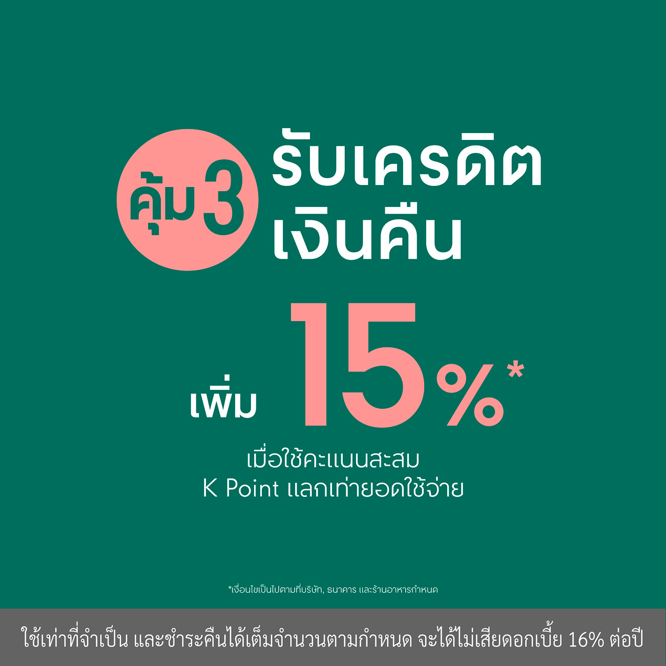 🍽 คุ้ม 3 รับเครดิตเงินคืนเพิ่ม 15%* เมื่อใช้คะแนนสะสม K Point แลกเท่ายอดใช้จ่ายในหมวดร้านอาหาร