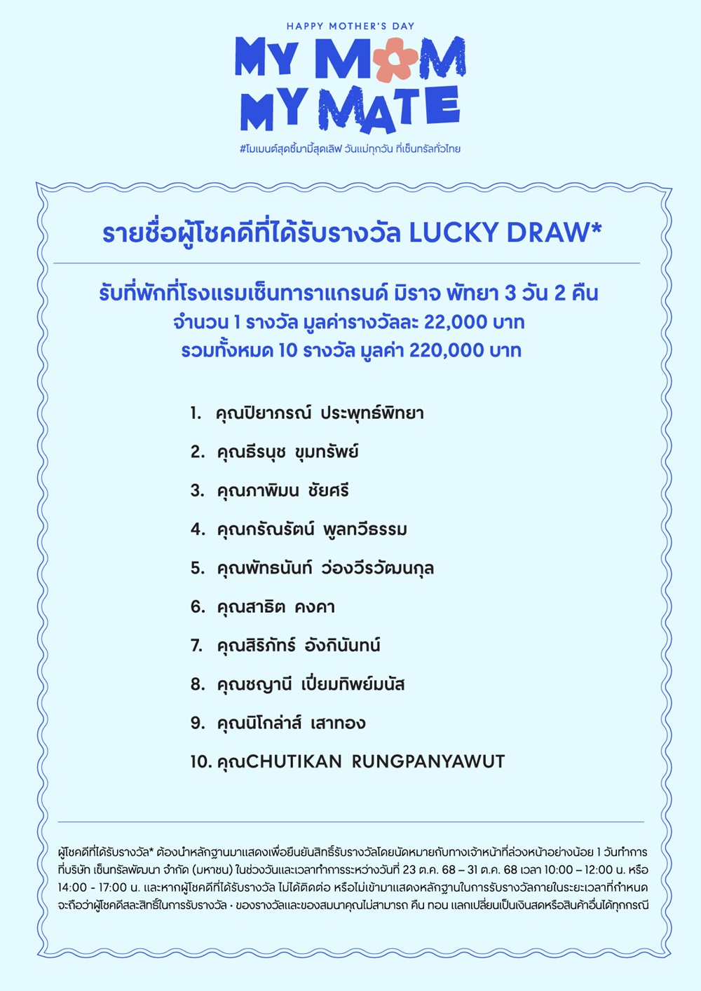 คุณอยู่ที่: หน้าหลัก Shopping ติดตามข่าวสารโปรโมชั่นส่วนลด ในศูนย์การค้าเซ็นทรัลทั่วประเทศ ประกาศรายชื่อลูกค้าที่ได้รับรางวัล LUCKY DRAW แคมเปญ My Mom, My Mate 24 ต.ค. 2568 share : อ่านข่าวทั้งหมด