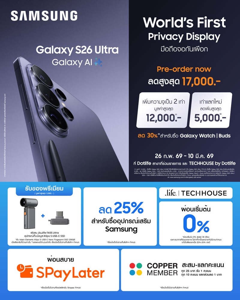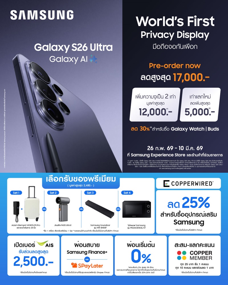 จองเป็นเจ้าของก่อนใคร Galaxy S26 Series ได้แล้ววันนี้ พร้อมรับส่วนลดสูงสุด 17,000.- คุ้มกว่าเห็นๆ ด้วยสิทธิพิเศษแบบจัดเต็ม