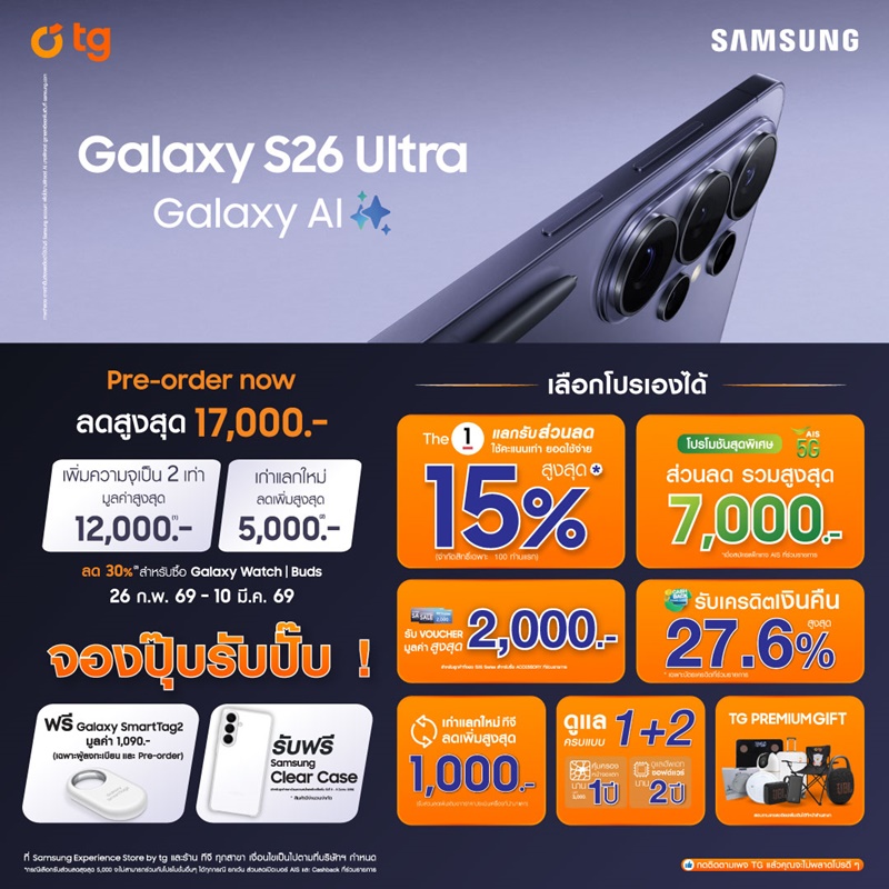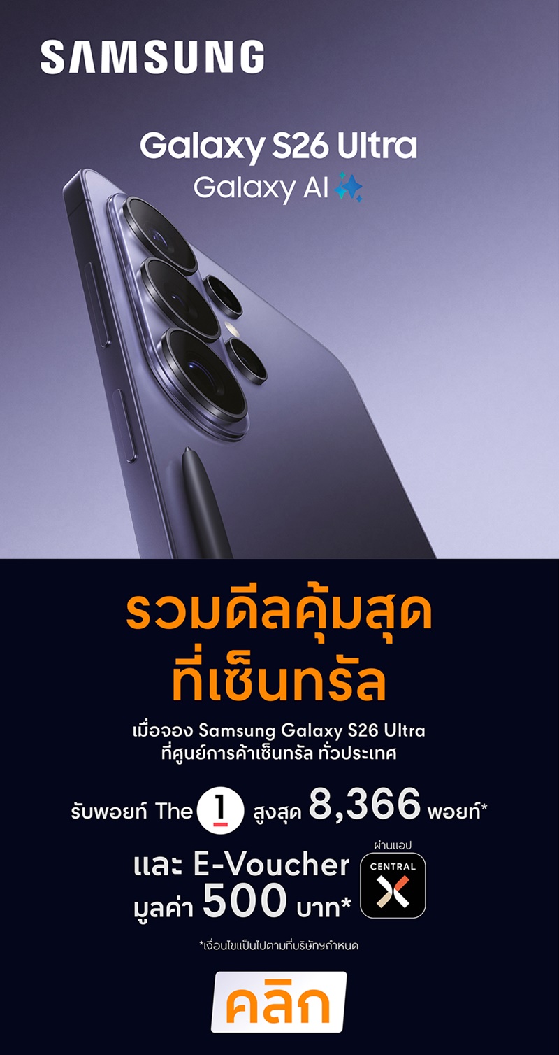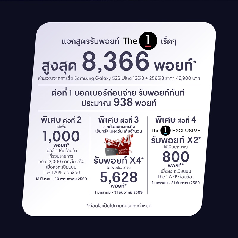 👉รับพอยท์ The 1 สูงสุด 8,366 พอยท์* (คำนวนจาก Samsung Galaxy S26 Ultra 12GB + 256GB ราคา 46,900 บาท)