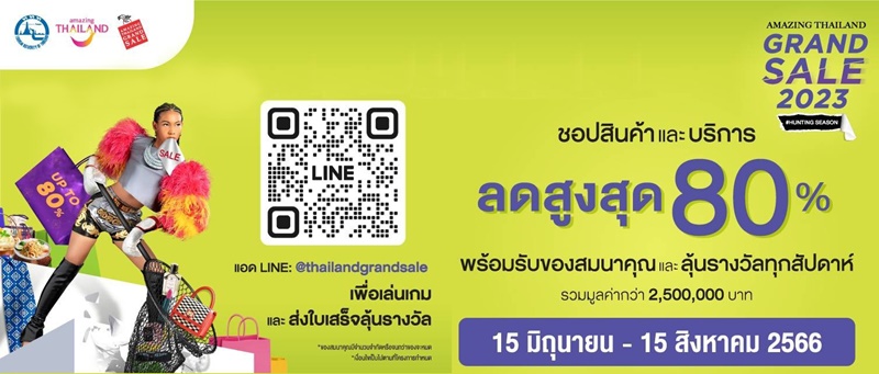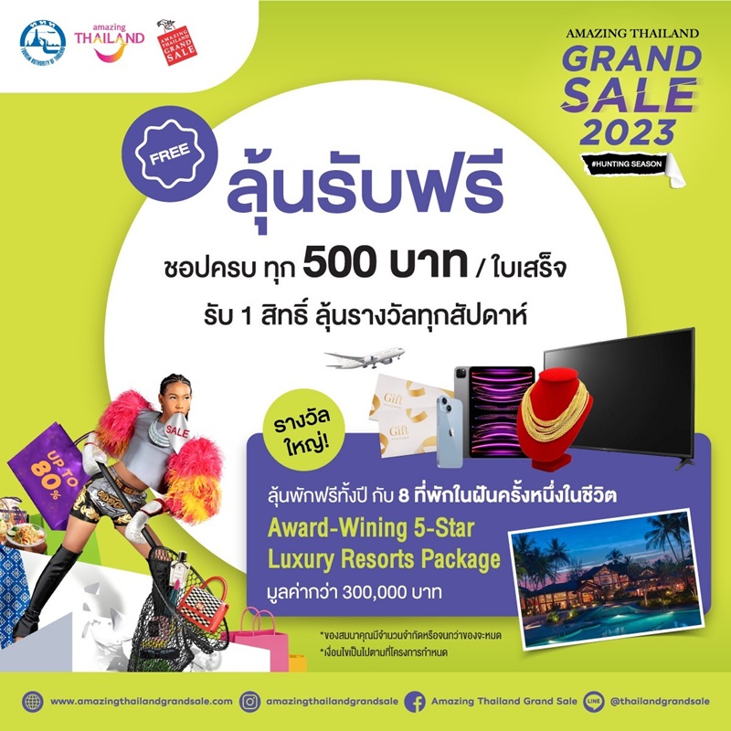 - ต่อที่ 2 ช้อปครบทุก 500 บาท รับ 1 สิทธิ์/ใบเสร็จ ผ่านทาง LINE: @thailandgrandsale ลุ้นรับของสมนาคุณทุกสัปดาห์ รวมมูลค่ากว่า 2,500,000 บาท